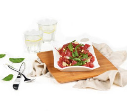 Carpaccio versgemaakt met pijnboompitten, parmezaanse kaas en huisgemaakte dressing